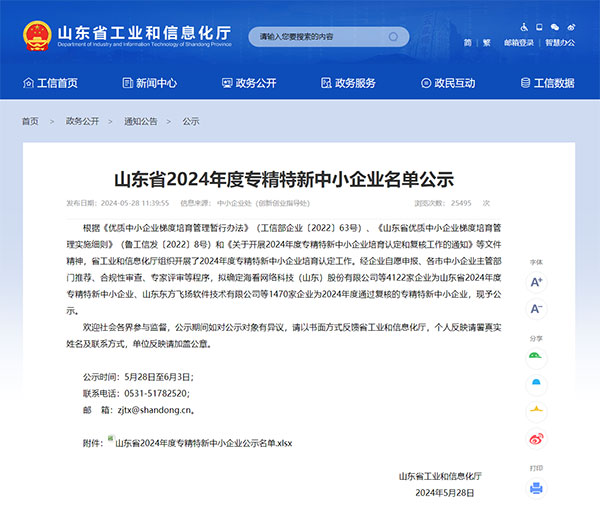 近日,山東省工業和信息化廳公示了2024年度專精特新中小企業名單,經過企業自愿申報、各市中小企業主管部門推薦、合規性審查...