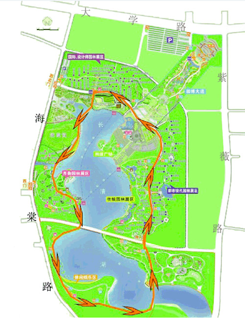 本次大賽舉辦地濟(jì)南國(guó)際園博園是目前國(guó)內(nèi)陸地面積最大的園博園。園內(nèi)展園總數(shù)超過(guò)一百個(gè),包括17個(gè)省內(nèi)城市、45個(gè)其他城市、我國(guó)港澳臺(tái)地區(qū)以及21個(gè)國(guó)外城市的主題園區(qū)。大賽分為專業(yè)組和業(yè)余組,專業(yè)組男、女各取前十名進(jìn)行獎(jiǎng)勵(lì),業(yè)余組男、女各取前20名進(jìn)行獎(jiǎng)勵(lì)。參賽者們將在園博園環(huán)繞長(zhǎng)清湖奔跑,專業(yè)組15公里,業(yè)余組7.5公里。